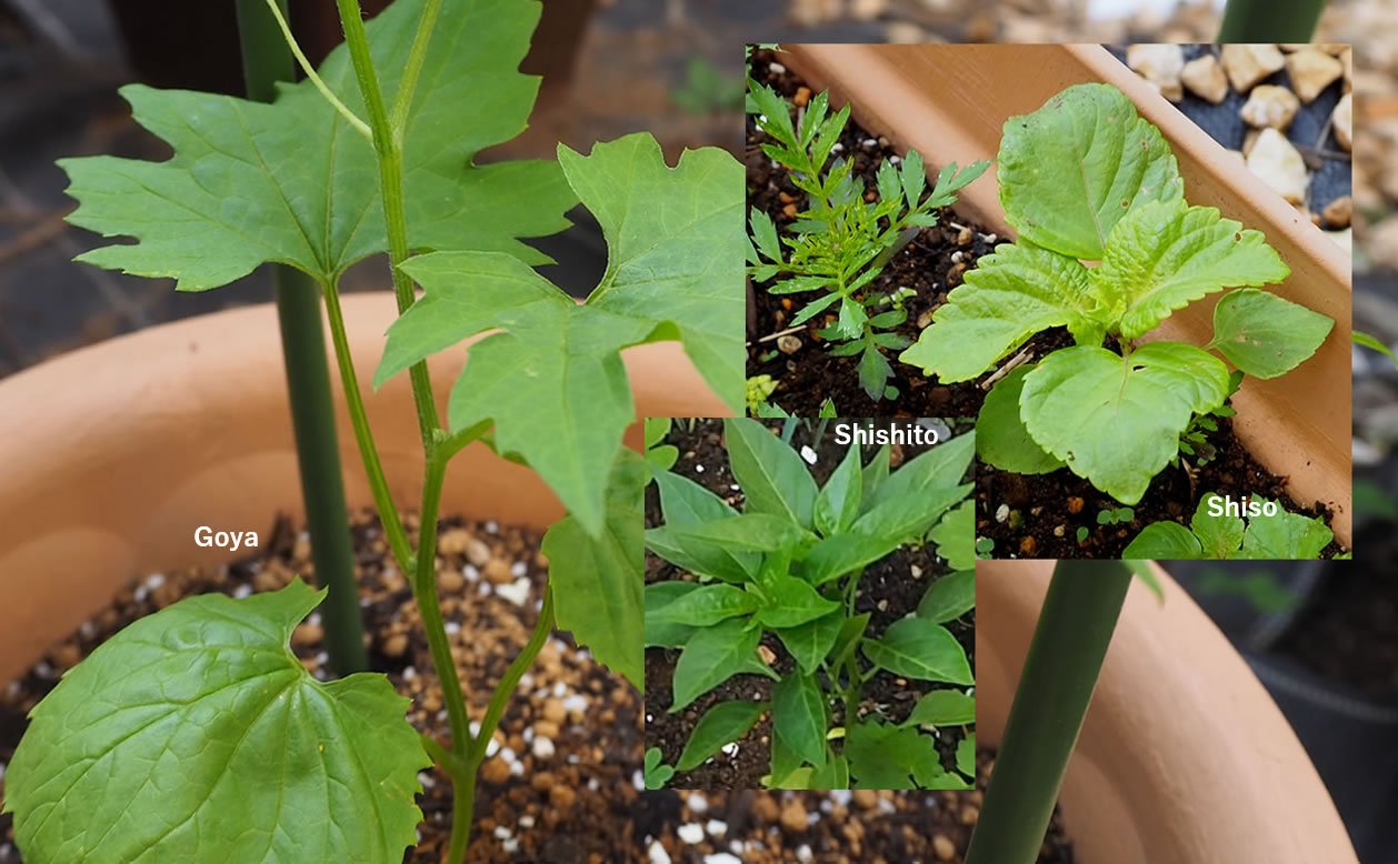 シソ、ゴーヤ、シシトウ。自宅で作った堆肥を使い育てました。
